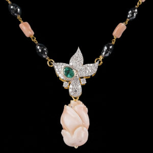 Embrace the elegance with the “Black diamond Coral Bloom”. Adorned with barrel shaped black diamond beads and delicate light pinkish-orange coral tubes, its pendant boasts natural white round diamonds and…