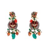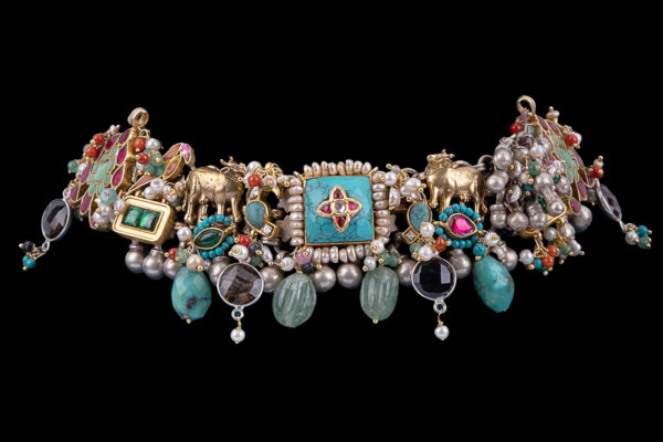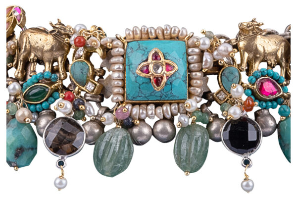 This Necklace is Crafted in 92.5 silver with intricate designs, adorned with motifs reflecting cultural richness. The black thread used enhances its allure, offering adjustable length for personalised comfort. Embellished with motifs of birds and sacred cows, crafted meticulously with kundan style work, it features a centerpiece of turquoise and a pink kundan studded flower. The addition of pearls, green quartz, coral beads, and smokey quartz stone drops enriches its vibrancy, offering a unique blend of colors and textures.
