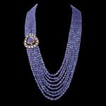 The pendant is adorned with floral and leaf motifs at the top and bottom, embellished with shimmering moissanite diamonds and polki, enhancing the necklace’s timeless allure. Hanging delicately from the base is a pearl tassel, its luminous pearls cascading like a graceful waterfall, adding a touch of modern sophistication to this piece.