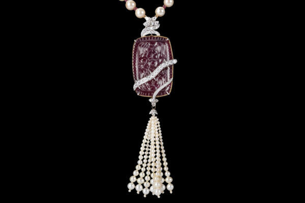 Discover the exquisite elegance of our Ruby Pearl Reverie necklace, a testament to artisanal craftsmanship and natural beauty. At its heart lies a stunning natural ruby, meticulously carved into a rectangular shape with a captivating floral motif at its centre. This radiant gem is set in lustrous 14k yellow gold, complemented by delicate vine motifs that gracefully wrap around the stone. Each vine is meticulously polished in white gold and studded with sparkling moissanite diamonds, adding a mesmerizing brilliance to the intricate design.