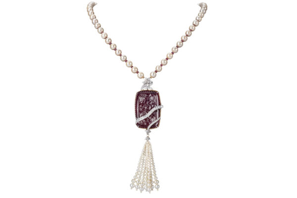 Cradled in 14K gold, our Ruby Pearl Reverie necklace enchants with a ruby heart, delicately carved and embraced by vines that whisper stories of blossoms and leaves. Each vine, adorned with moissanite diamonds, dances in harmony with alternating pearls and ruby beads, weaving a tapestry of timeless allure. At its base, a pearl tassel cascades like a gentle waterfall, adding a touch of contemporary elegance to this symphony of craftsmanship and beauty. This necklace features a 22k yellow gold hook, ensuring a secure closure