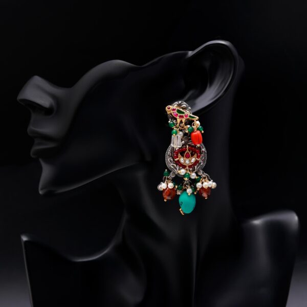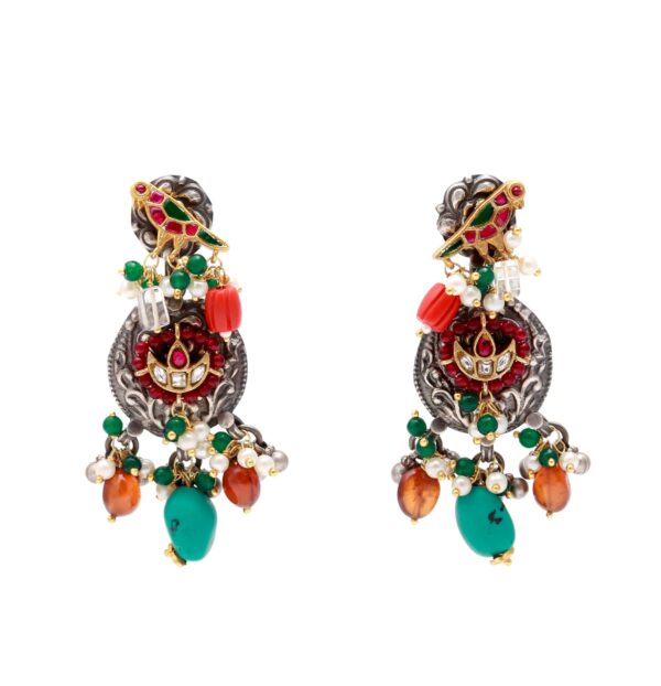 Discover elegance with our Satrangi Silver Bird Earrings. Featuring a stunning jadau bird motif, these earrings boast vibrant corals, turquoise, pearls, and garnet gemstone beads.